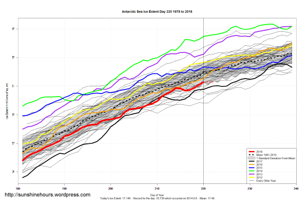 Sea Ice Extent (Global Antarctic and Arctic) – Day 220 – 2018