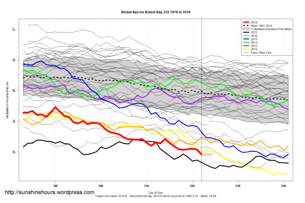 Sea Ice Extent (Global Antarctic and Arctic) – Day 222 – 2018