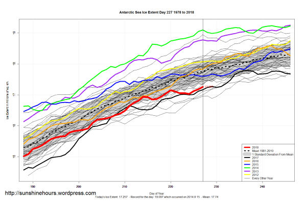 Sea Ice Extent (Global Antarctic and Arctic) – Day 227 – 2018