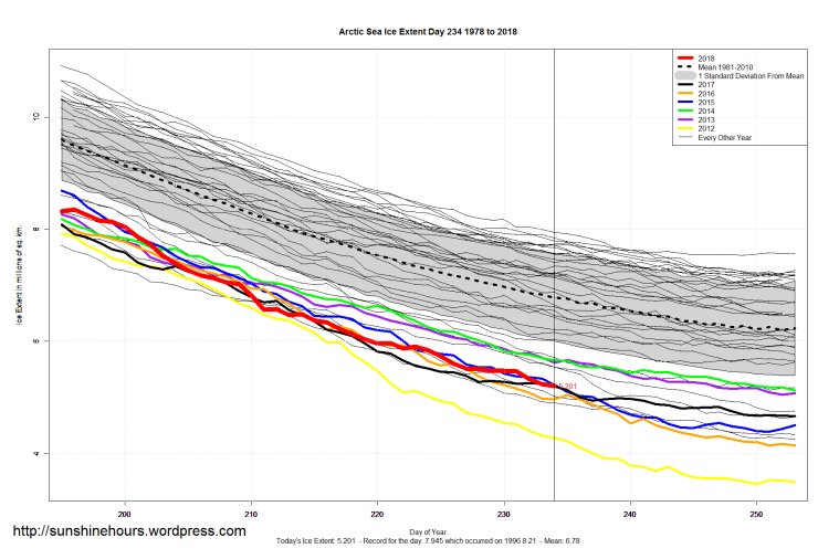 Sea Ice Extent (Global Antarctic and Arctic) – Day 234 – 2018 Published on August 23, 2018August 23, 2018 by sunshinehours1 South / North Share this: Click to share on X (Opens in new window) X Click to share on Facebook (Opens in new window) Facebook Like Loading... Related