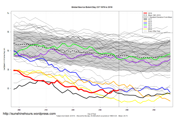 Sea Ice Extent (Global Antarctic and Arctic) – Day 237 – 2018
