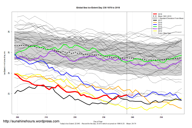 Sea Ice Extent (Global Antarctic and Arctic) – Day 238 – 2018 Published on August 27, 2018August 27, 2018 by sunshinehours1 In the Arctic it is 1.2 million sq km higher than it was in 2012 on the same day. 2012 2016 2007 2011 2015 and 2017 were lower than 2018. South / North Share this: Click to share on X (Opens in new window) X Click to share on Facebook (Opens in new window) Facebook Like Loading... Related