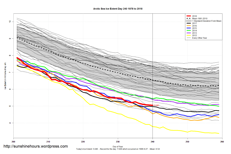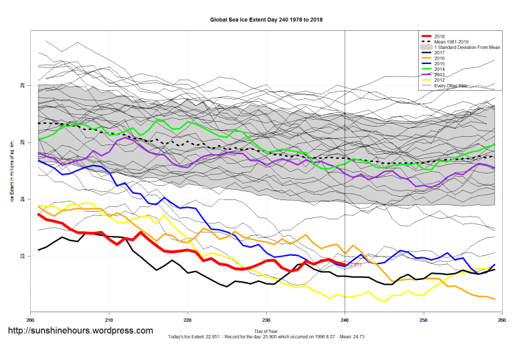 Sea Ice Extent (Global Antarctic and Arctic) – Day 240 – 2018 Published on August 29, 2018August 29, 2018 by sunshinehours1 Arctic: 2018 is higher than these years on day 240: 2012 2016 2015 2007 2011 2017 2008 Arctic: 2018 on day 240 is almost 1.3million sq km higher than 2012 South / North Share this: Click to share on X (Opens in new window) X Click to share on Facebook (Opens in new window) Facebook Like Loading... Related