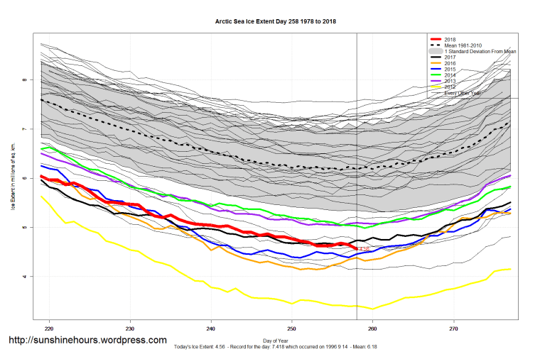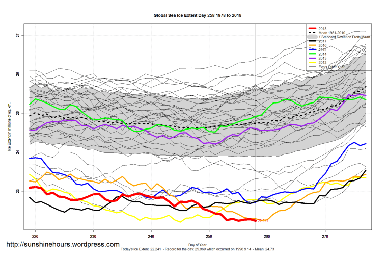 Sea Ice Extent (Global Antarctic and Arctic) – Day 258 – 2018 Published on September 16, 2018September 16, 2018 by sunshinehours1 South / North Share this: Click to share on X (Opens in new window) X Click to share on Facebook (Opens in new window) Facebook Like Loading... Related