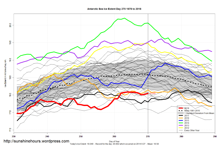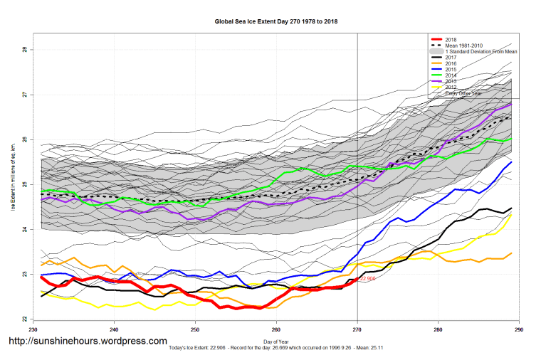 Sea Ice Extent (Global Antarctic and Arctic) – Day 270 – 2018 Published on September 28, 2018September 28, 2018 by sunshinehours1 South / North Share this: Click to share on X (Opens in new window) X Click to share on Facebook (Opens in new window) Facebook Like Loading... Related