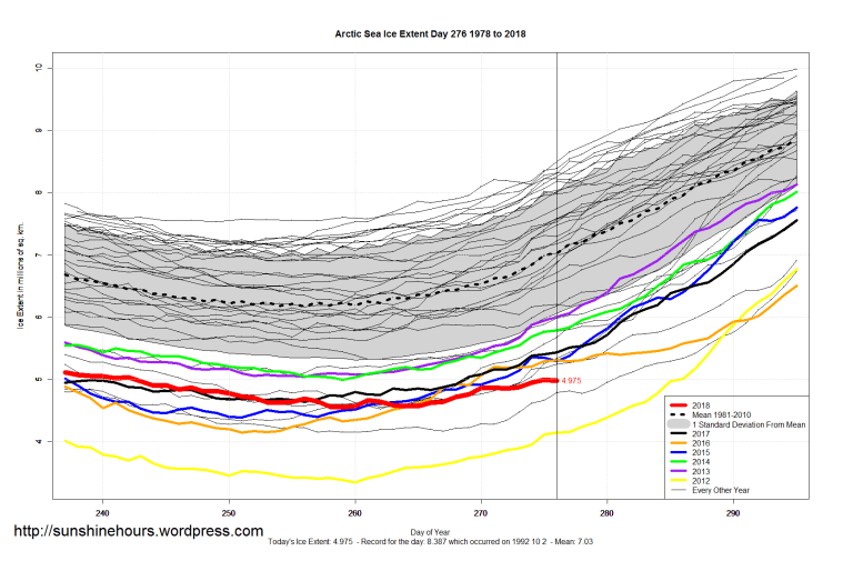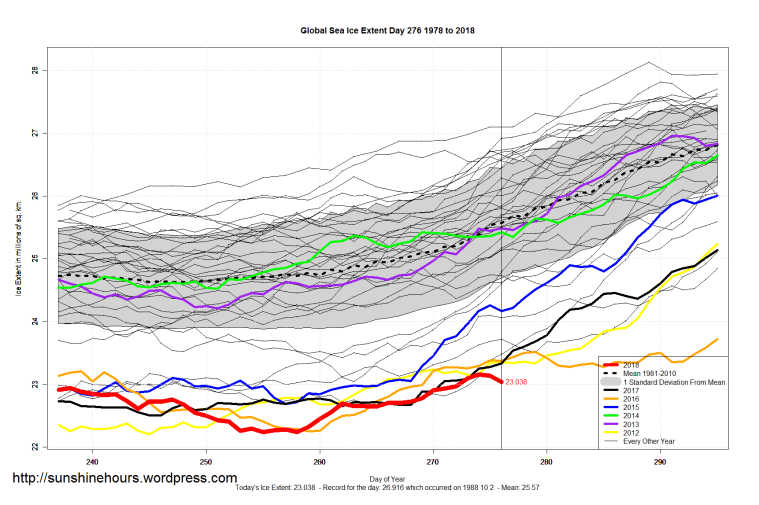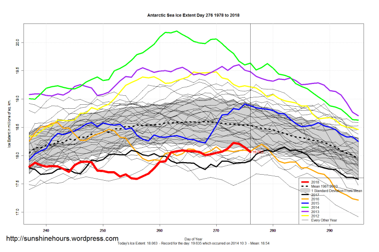Sea Ice Extent (Global Antarctic and Arctic) – Day 276 – 2018 Published on October 4, 2018October 4, 2018 by sunshinehours1 For a while this year Antarctic was on track to set a record for lowest maximum. A late surge has now put it at 4th lowest maximum. 1986, 2002 and 2017 were lower. South / North Share this: Click to share on X (Opens in new window) X Click to share on Facebook (Opens in new window) Facebook Like Loading... Related