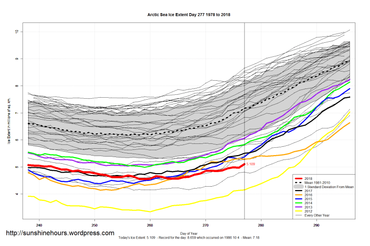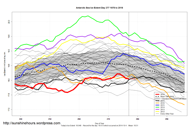 Sea Ice Extent (Global Antarctic and Arctic) – Day 277 – 2018 Published on October 5, 2018October 5, 2018 by sunshinehours1 South / North Share this: Share on X (Opens in new window) X Share on Facebook (Opens in new window) Facebook Like Loading... Related