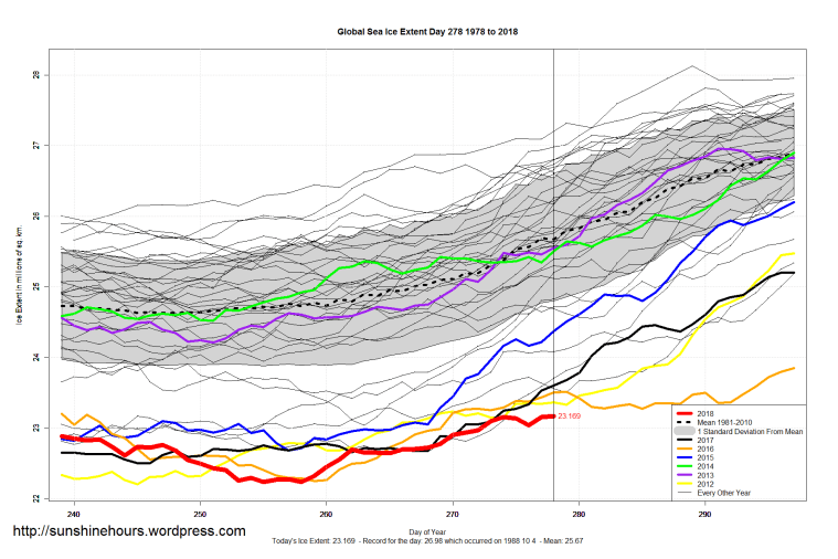 Sea Ice Extent (Global Antarctic and Arctic) – Day 278 – 2018 Published on October 6, 2018October 6, 2018 by sunshinehours1 South / North Share this: Click to share on X (Opens in new window) X Click to share on Facebook (Opens in new window) Facebook Like Loading... Related