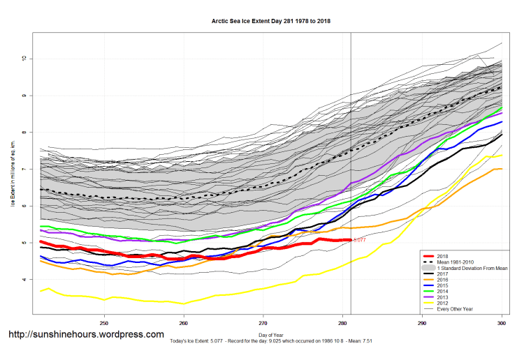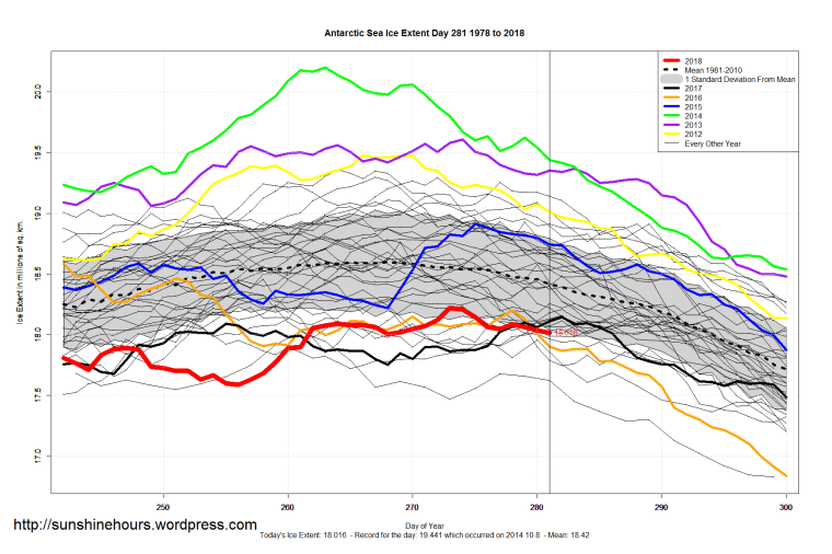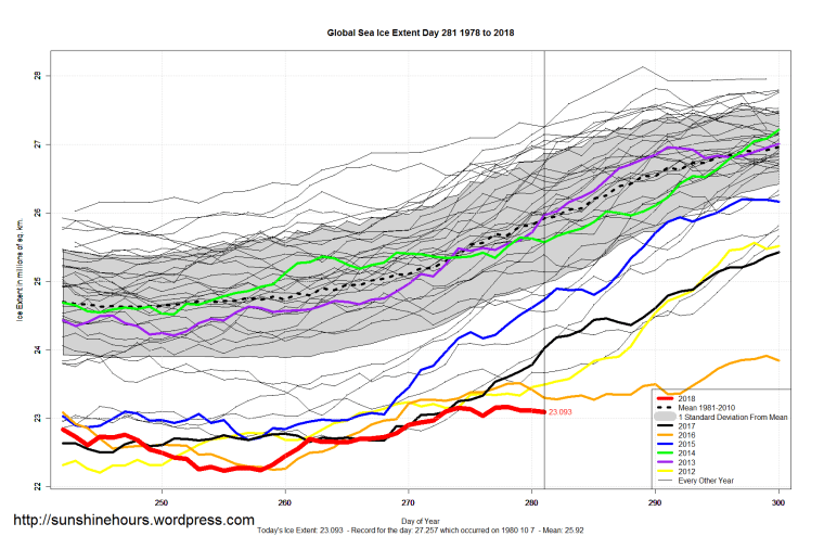 Sea Ice Extent (Global Antarctic and Arctic) – Day 281 – 2018 Published on October 9, 2018October 9, 2018 by sunshinehours1 South / North Share this: Click to share on X (Opens in new window) X Click to share on Facebook (Opens in new window) Facebook Like Loading... Related