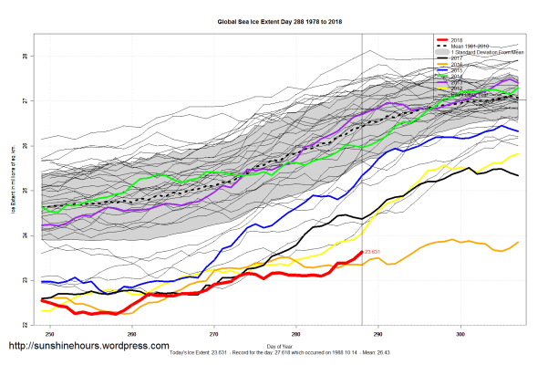 Sea Ice Extent (Global Antarctic and Arctic) – Day 288 – 2018