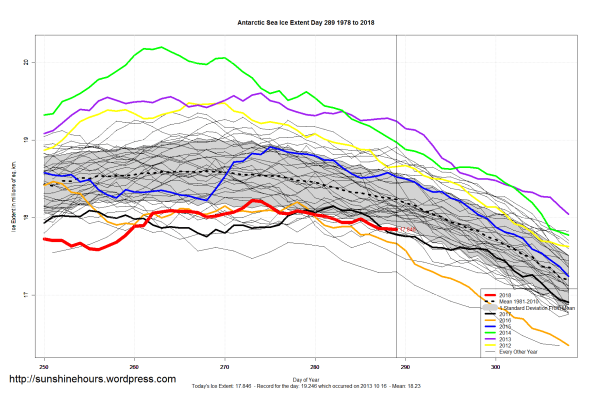 Sea Ice Extent (Global Antarctic and Arctic) – Day 289 – 2018