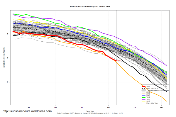 Sea Ice Extent (Global Antarctic and Arctic) – Day 313 – 2018