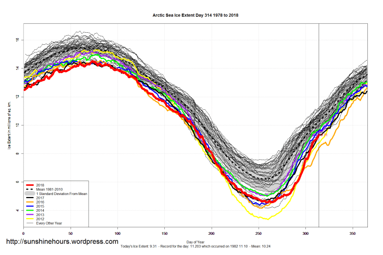 Sea Ice Extent (Global Antarctic and Arctic) – Day 314 – 2018 Published on November 11, 2018November 11, 2018 by sunshinehours1 South / North Share this: Click to share on X (Opens in new window) X Click to share on Facebook (Opens in new window) Facebook Like Loading... Related