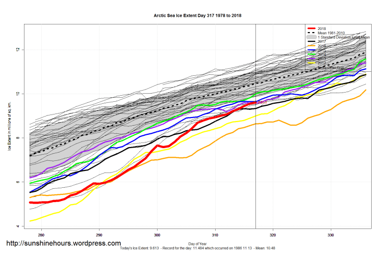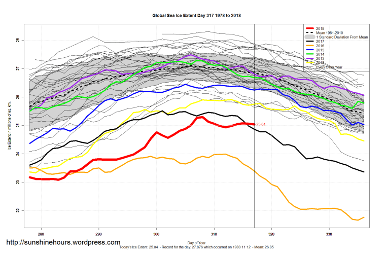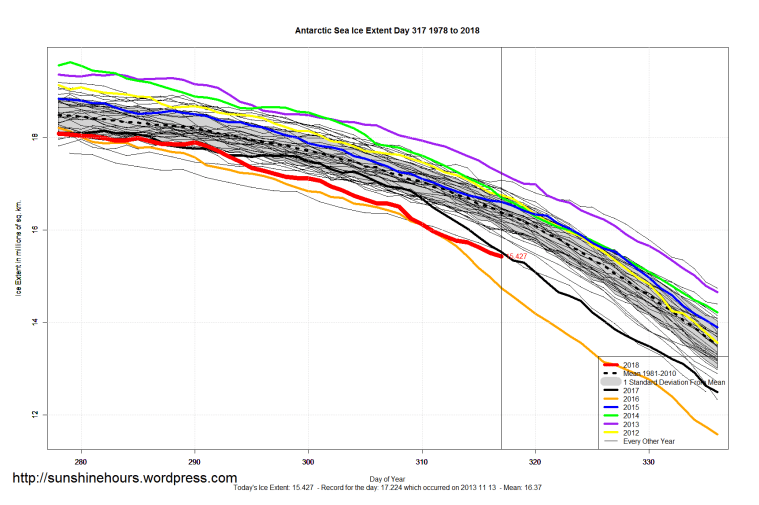 Sea Ice Extent (Global Antarctic and Arctic) – Day 317 – 2018 Published on November 14, 2018November 14, 2018 by sunshinehours1 South / North Share this: Click to share on X (Opens in new window) X Click to share on Facebook (Opens in new window) Facebook Like Loading... Related