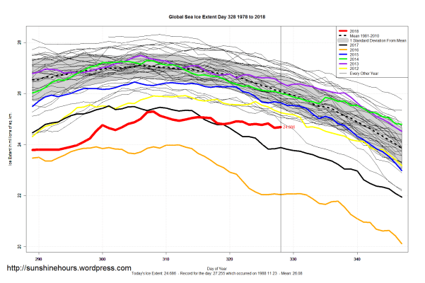 Sea Ice Extent (Global Antarctic and Arctic) – Day 328 – 2018