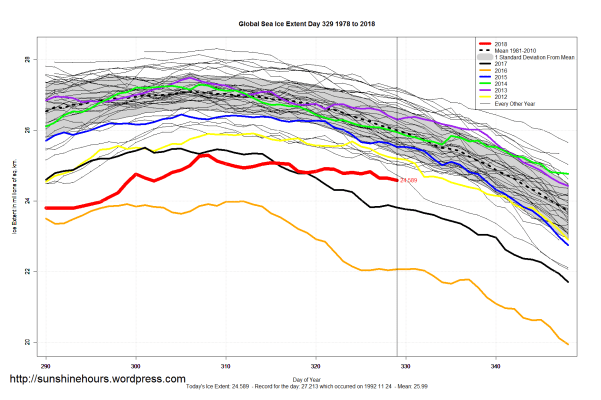 Sea Ice Extent (Global Antarctic and Arctic) – Day 329 – 2018