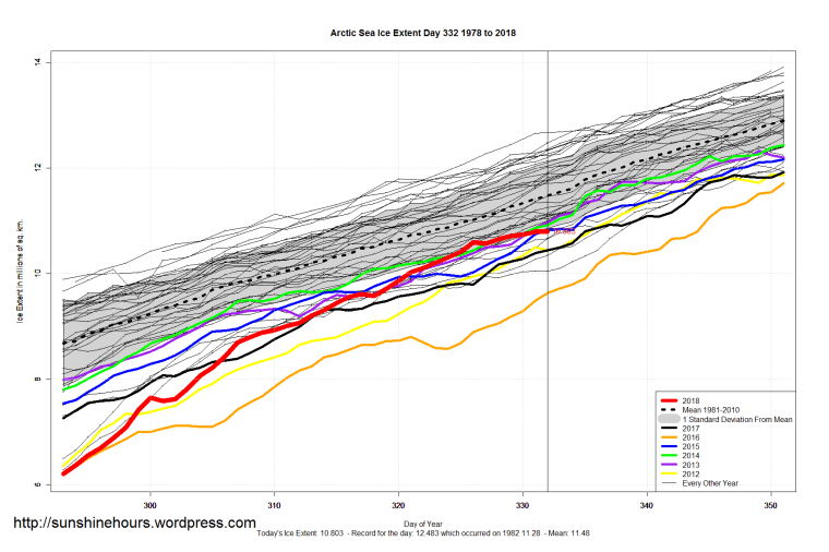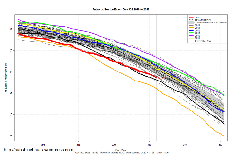Sea Ice Extent (Global Antarctic and Arctic) – Day 332 – 2018 Published on November 29, 2018November 29, 2018 by sunshinehours1 South / North Share this: Click to share on X (Opens in new window) X Click to share on Facebook (Opens in new window) Facebook Like Loading... Related