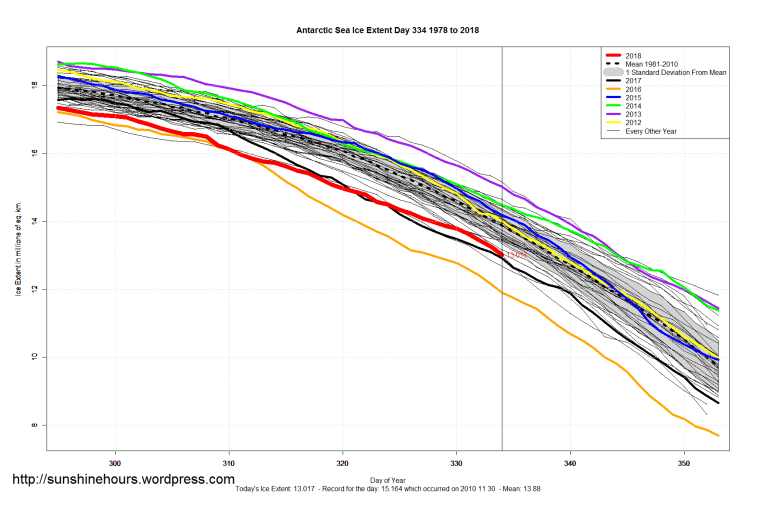 Sea Ice Extent (Global Antarctic and Arctic) – Day 334 – 2018 Published on December 1, 2018December 1, 2018 by sunshinehours1 South / North Share this: Click to share on X (Opens in new window) X Click to share on Facebook (Opens in new window) Facebook Like Loading... Related