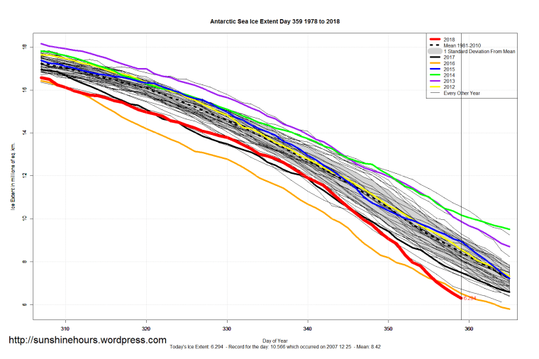 Sea Ice Extent (Global Antarctic and Arctic) – Day 359 – 2018 Published on December 26, 2018December 26, 2018 by sunshinehours1 South / North Share this: Click to share on X (Opens in new window) X Click to share on Facebook (Opens in new window) Facebook Like Loading... Related