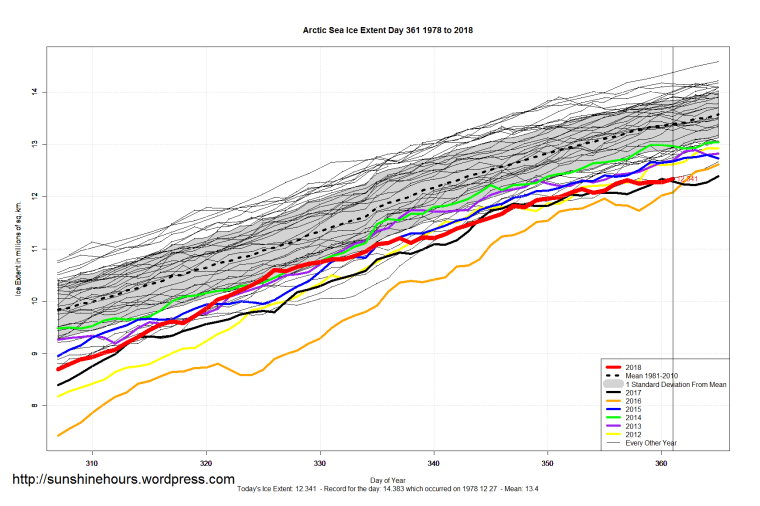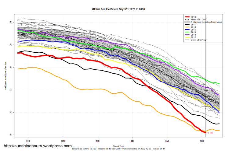 Sea Ice Extent (Global Antarctic and Arctic) – Day 361 – 2018 Published on December 28, 2018December 28, 2018 by sunshinehours1 South / North Share this: Click to share on X (Opens in new window) X Click to share on Facebook (Opens in new window) Facebook Like Loading... Related