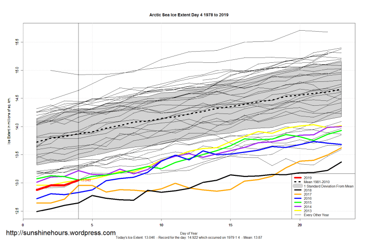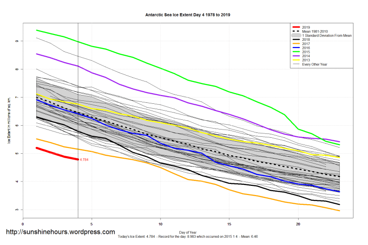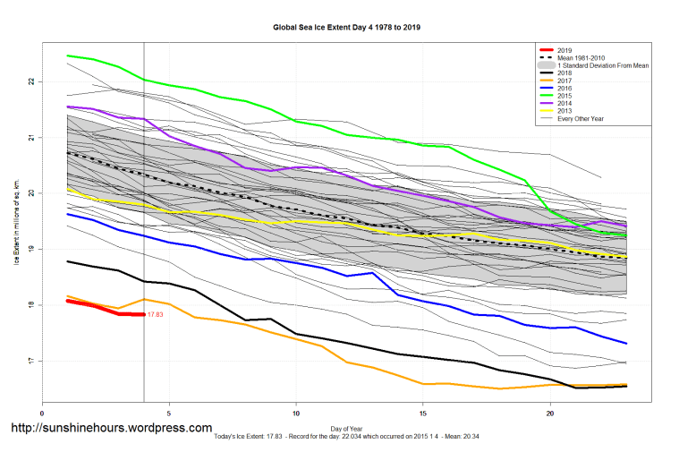 Sea Ice Extent (Global Antarctic and Arctic) – Day 4 – 2019 Published on January 5, 2019January 5, 2019 by sunshinehours1 South / North Share this: Click to share on X (Opens in new window) X Click to share on Facebook (Opens in new window) Facebook Like Loading... Related