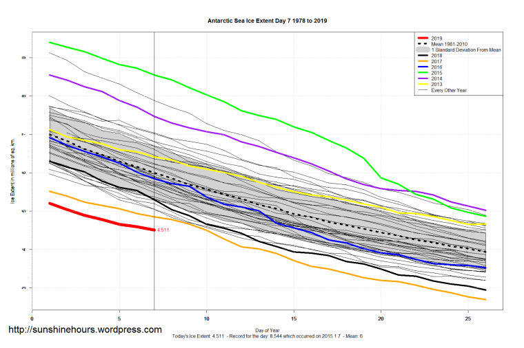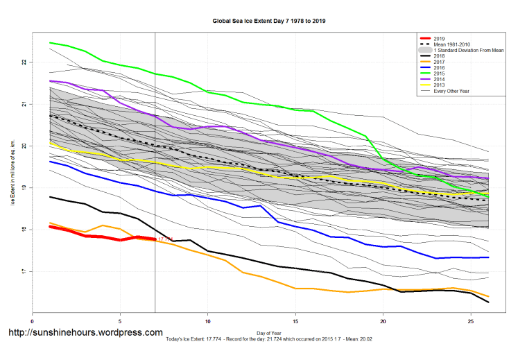 Arctic 564,000 sq km Higher Than 2018 – Sea Ice Extent (Global Antarctic and Arctic) – Day 7 – 2019 Published on January 8, 2019January 8, 2019 by sunshinehours1 South / North Share this: Click to share on X (Opens in new window) X Click to share on Facebook (Opens in new window) Facebook Like Loading... Related