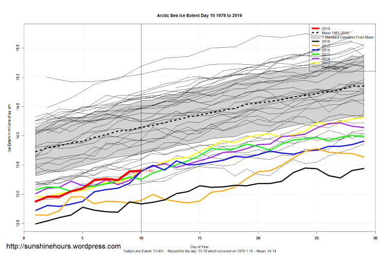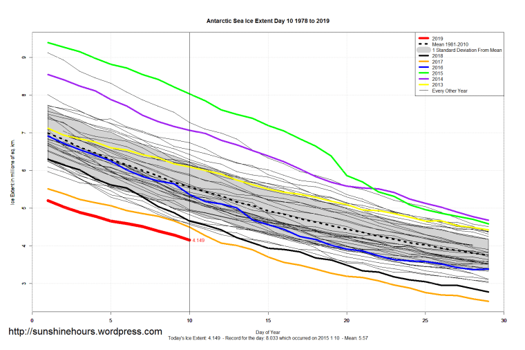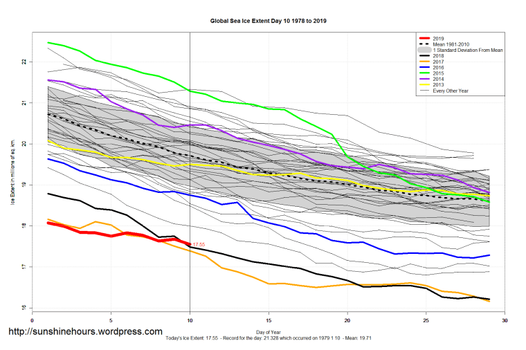 Sea Ice Extent (Global Antarctic and Arctic) – Day 10 – 2019