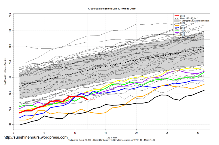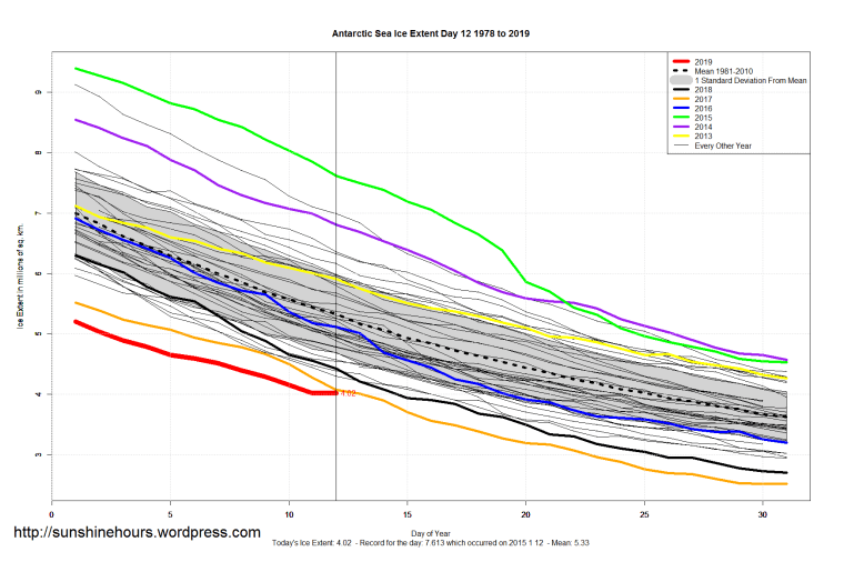 Sea Ice Extent (Global Antarctic and Arctic) – Day 12 – 2019 Published on January 13, 2019January 13, 2019 by sunshinehours1 South / North Share this: Click to share on X (Opens in new window) X Click to share on Facebook (Opens in new window) Facebook Like Loading... Related