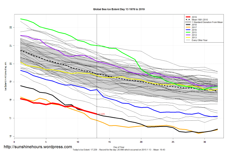 Sea Ice Extent (Global Antarctic and Arctic) – Day 13 – 2019 Published on January 14, 2019January 14, 2019 by sunshinehours1 South / North Share this: Click to share on X (Opens in new window) X Click to share on Facebook (Opens in new window) Facebook Like Loading... Related