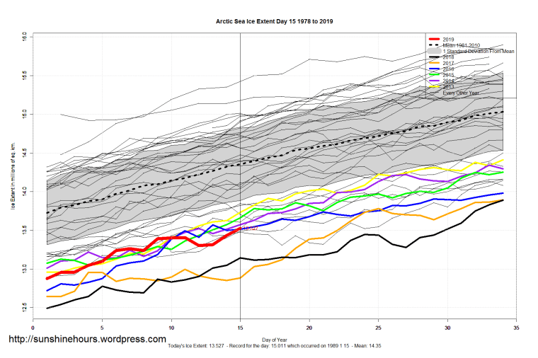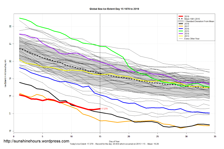 Arctic 640,000 sq km Higher Than 2017 – Sea Ice Extent (Global Antarctic and Arctic) – Day 15 – 2019 Published on January 16, 2019January 16, 2019 by sunshinehours1 South / North Share this: Click to share on X (Opens in new window) X Click to share on Facebook (Opens in new window) Facebook Like Loading... Related