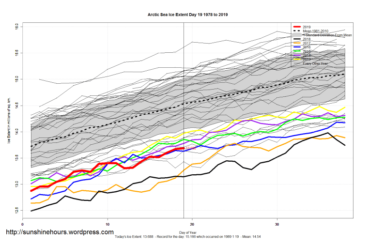 Sea Ice Extent (Global Antarctic and Arctic) – Day 19 – 2019 Published on January 20, 2019January 20, 2019 by sunshinehours1 South / North Share this: Click to share on X (Opens in new window) X Click to share on Facebook (Opens in new window) Facebook Like Loading... Related