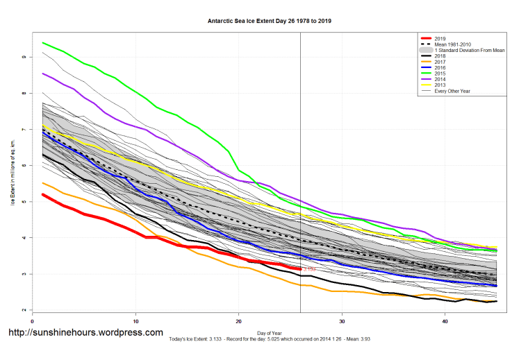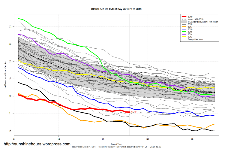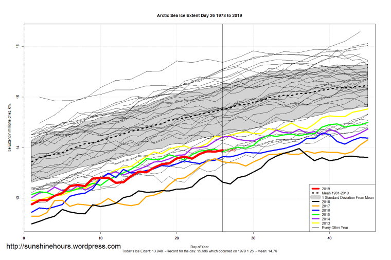 Arctic Higher Than 2005 and 2006 – Sea Ice Extent (Global Antarctic and Arctic) – Day 26 – 2019
