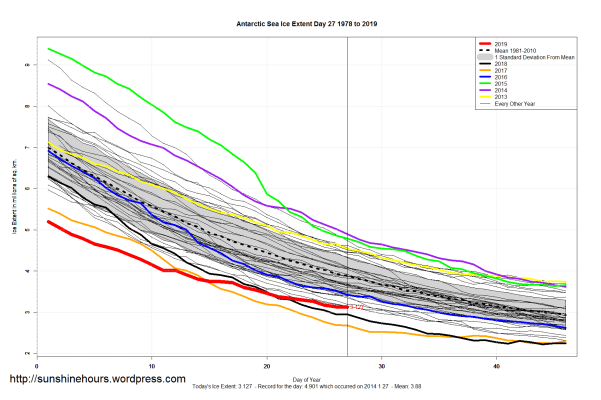 Arctic 770,000 sq km Higher Than 2018 – Sea Ice Extent (Global Antarctic and Arctic) – Day 27 – 2019