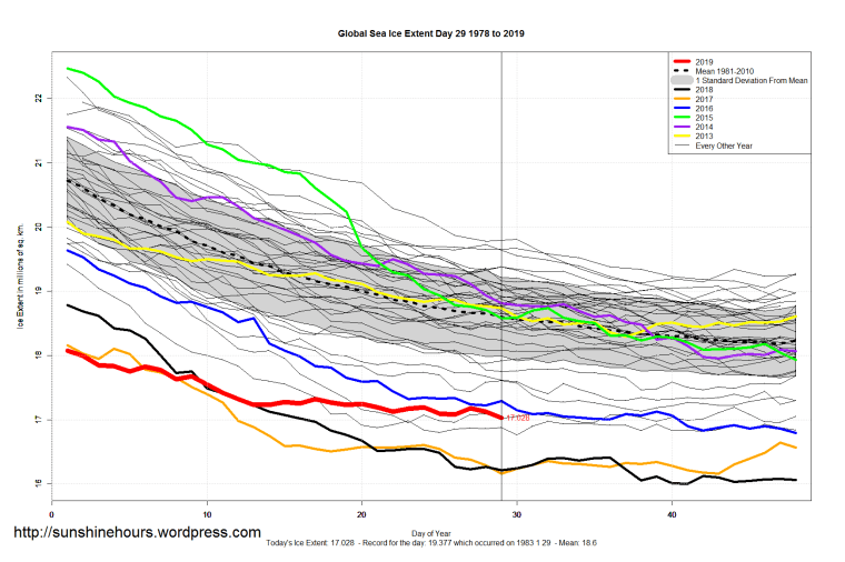 Sea Ice Extent (Global Antarctic and Arctic) – Day 29 – 2019 Published on January 30, 2019January 30, 2019 by sunshinehours1 South / North Share this: Click to share on X (Opens in new window) X Click to share on Facebook (Opens in new window) Facebook Like Loading... Related