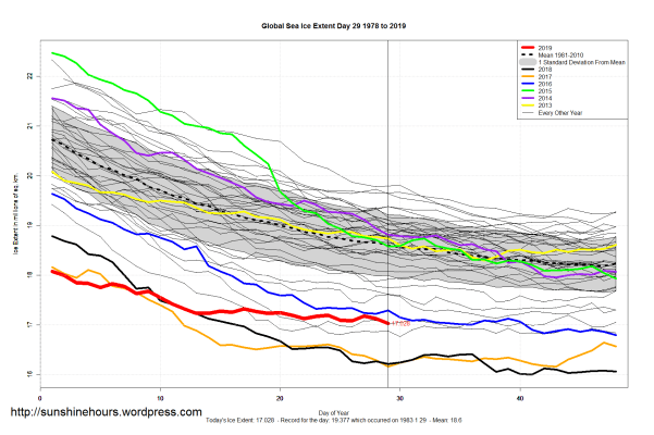 Sea Ice Extent (Global Antarctic and Arctic) – Day 29 – 2019