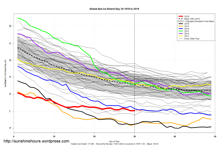 Sea Ice Extent (Global Antarctic and Arctic) – Day 30 – 2019 Published on January 31, 2019January 31, 2019 by sunshinehours1 South / North Share this: Click to share on X (Opens in new window) X Click to share on Facebook (Opens in new window) Facebook Like Loading... Related