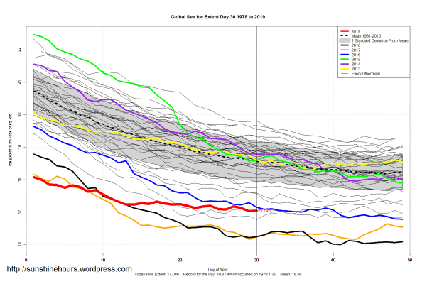 Sea Ice Extent (Global Antarctic and Arctic) – Day 30 – 2019