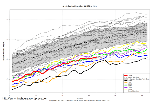 Sea Ice Extent (Global Antarctic and Arctic) – Day 33 – 2019