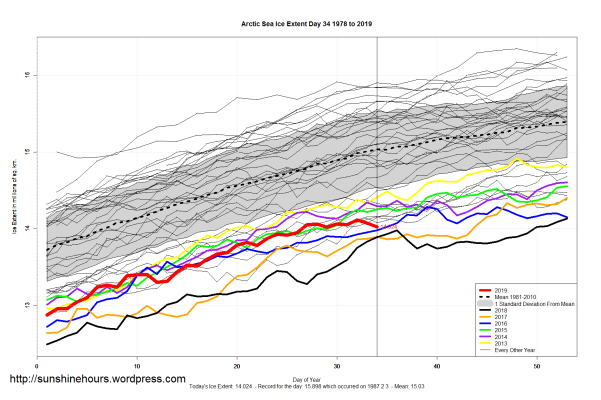 Sea Ice Extent (Global Antarctic and Arctic) – Day 34 – 2019