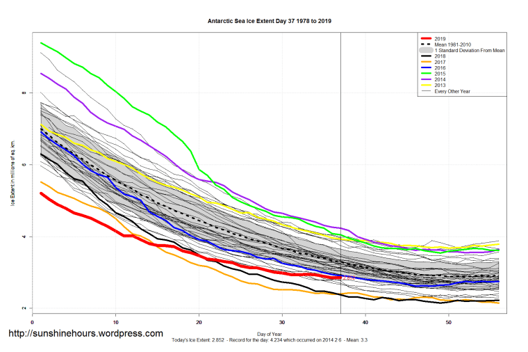 Sea Ice Extent (Global Antarctic and Arctic) – Day 37 – 2019 Published on February 7, 2019February 7, 2019 by sunshinehours1 South / North Share this: Click to share on X (Opens in new window) X Click to share on Facebook (Opens in new window) Facebook Like Loading... Related