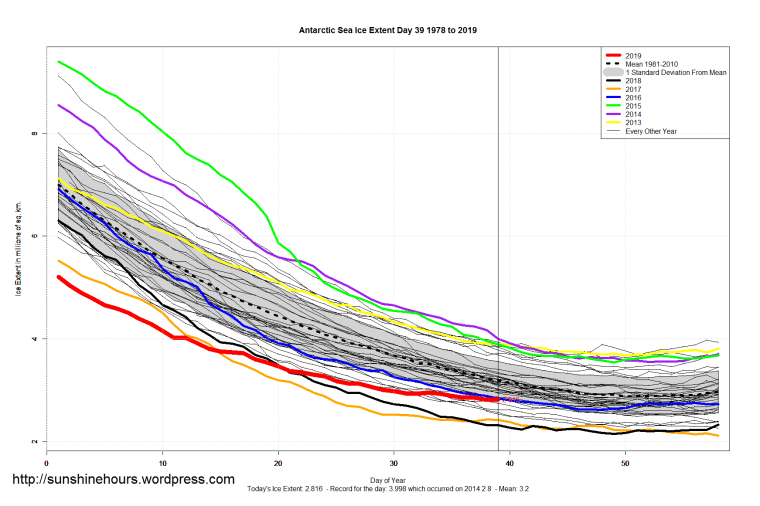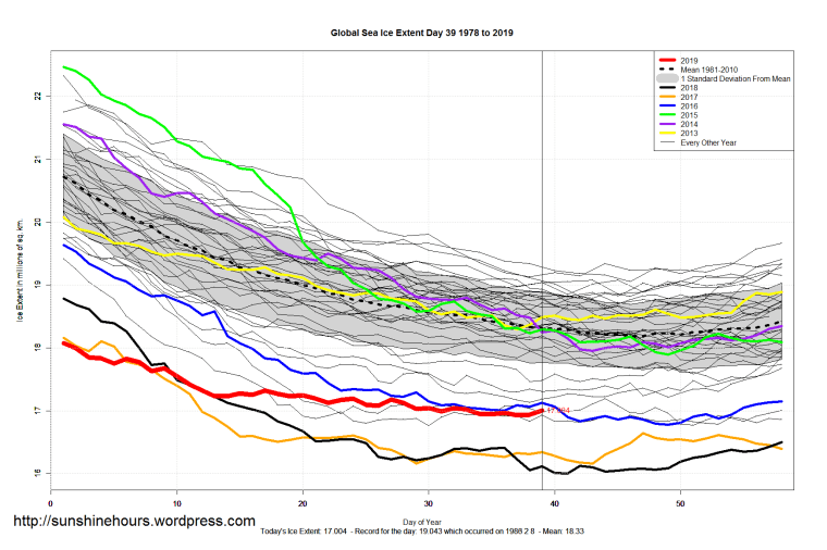 Sea Ice Extent (Global Antarctic and Arctic) – Day 39 – 2019 Published on February 9, 2019February 9, 2019 by sunshinehours1 South / North Share this: Click to share on X (Opens in new window) X Click to share on Facebook (Opens in new window) Facebook Like Loading... Related