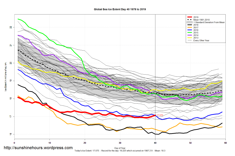 Sea Ice Extent (Global Antarctic and Arctic) – Day 40 – 2019 Published on February 10, 2019February 10, 2019 by sunshinehours1 South / North Share this: Click to share on X (Opens in new window) X Click to share on Facebook (Opens in new window) Facebook Like Loading... Related