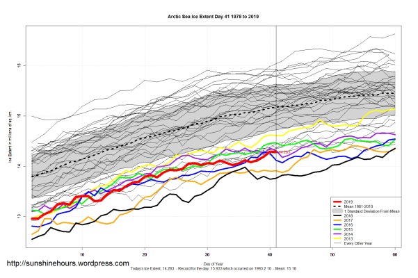 Global 1,000,000sqkm Above 2018 – Sea Ice Extent (Global Antarctic and Arctic) – Day 41 – 2019