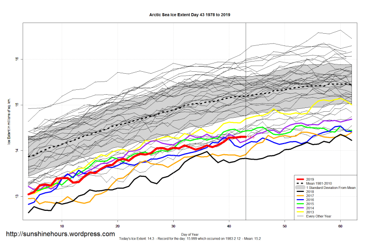 Sea Ice Extent (Global Antarctic and Arctic) – Day 43 – 2019 Published on February 13, 2019February 13, 2019 by sunshinehours1 South / North Share this: Click to share on X (Opens in new window) X Click to share on Facebook (Opens in new window) Facebook Like Loading... Related