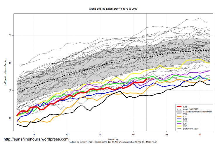 Global 1,000,000 sq km Higher Than 2018 – Sea Ice Extent (Global Antarctic and Arctic) – Day 44 – 2019