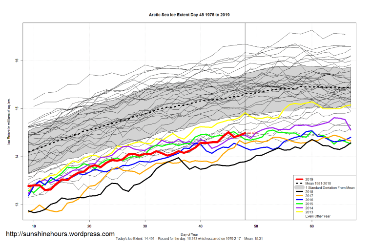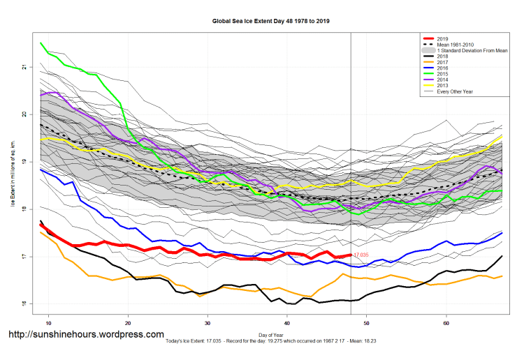 Sea Ice Extent (Global Antarctic and Arctic) – Day 48 – 2019 Published on February 18, 2019February 18, 2019 by sunshinehours1 South / North Share this: Click to share on X (Opens in new window) X Click to share on Facebook (Opens in new window) Facebook Like Loading... Related