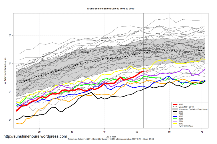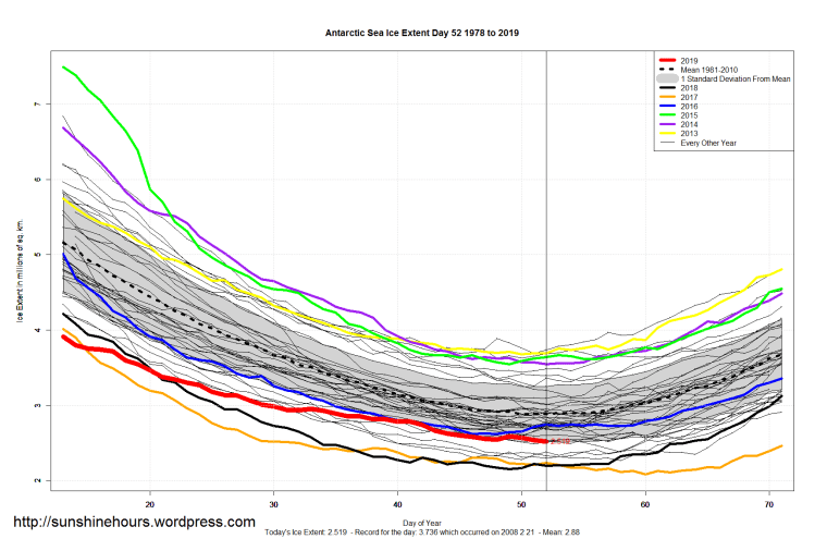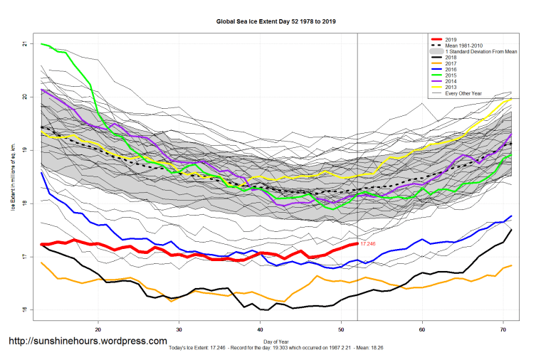 Arctic 11th Lowest For The Day – Sea Ice Extent (Global Antarctic and Arctic) – Day 52 – 2019 Published on February 22, 2019February 22, 2019 by sunshinehours1 11th lowest Arctic Sea Ice Extent for the day. Higher than 2018 2016 2017 2006 2005 2011 2015 2014 2007 2012 South / North Share this: Click to share on X (Opens in new window) X Click to share on Facebook (Opens in new window) Facebook Like Loading... Related