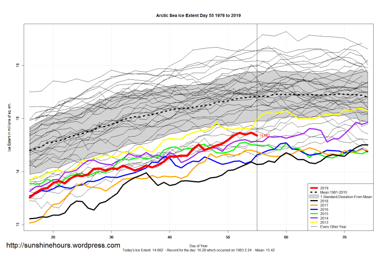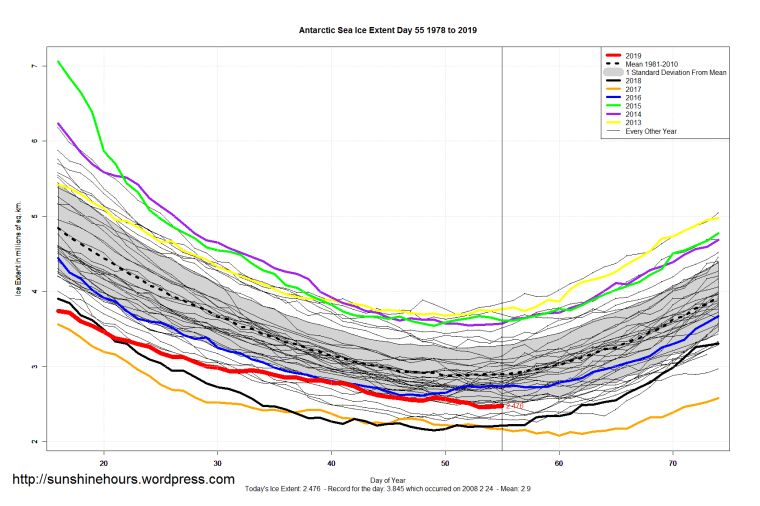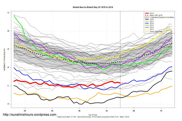 Sea Ice Extent (Global Antarctic and Arctic) – Day 55 – 2019 Published on February 25, 2019February 25, 2019 by sunshinehours1 South / North Share this: Click to share on X (Opens in new window) X Click to share on Facebook (Opens in new window) Facebook Like Loading... Related