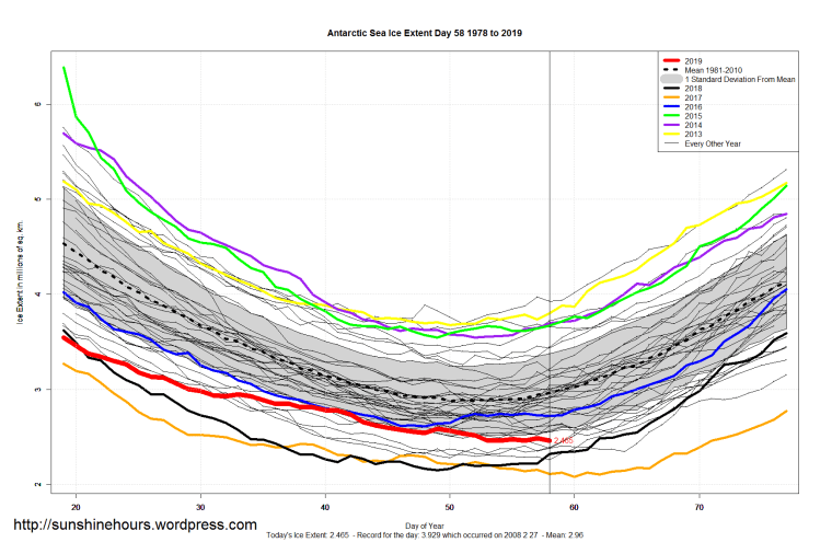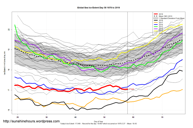 Sea Ice Extent (Global Antarctic and Arctic) – Day 58 – 2019 Published on February 28, 2019February 28, 2019 by sunshinehours1 South / North Share this: Click to share on X (Opens in new window) X Click to share on Facebook (Opens in new window) Facebook Like Loading... Related