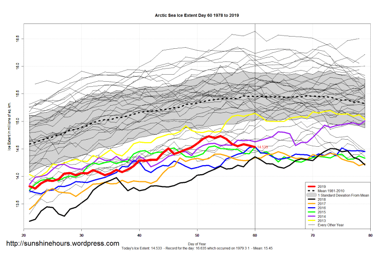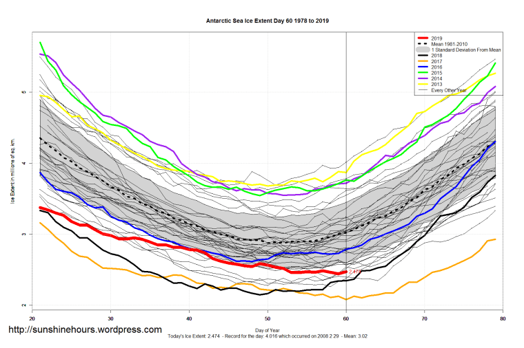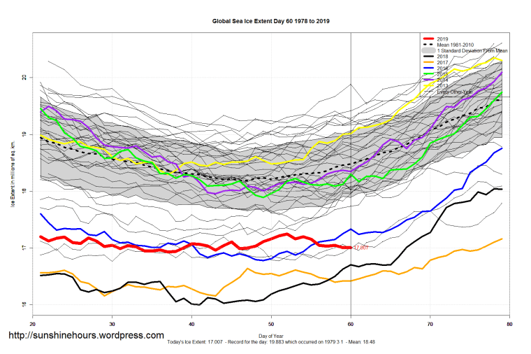 Sea Ice Extent (Global Antarctic and Arctic) – Day 60 – 2019 Published on March 2, 2019March 2, 2019 by sunshinehours1 South / North Share this: Click to share on X (Opens in new window) X Click to share on Facebook (Opens in new window) Facebook Like Loading... Related